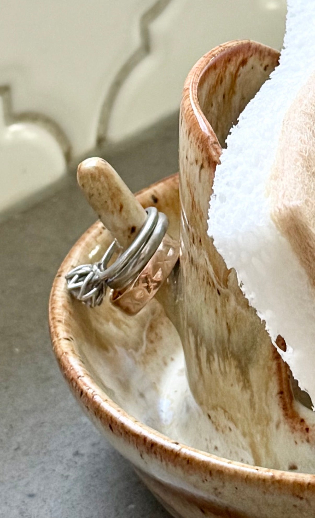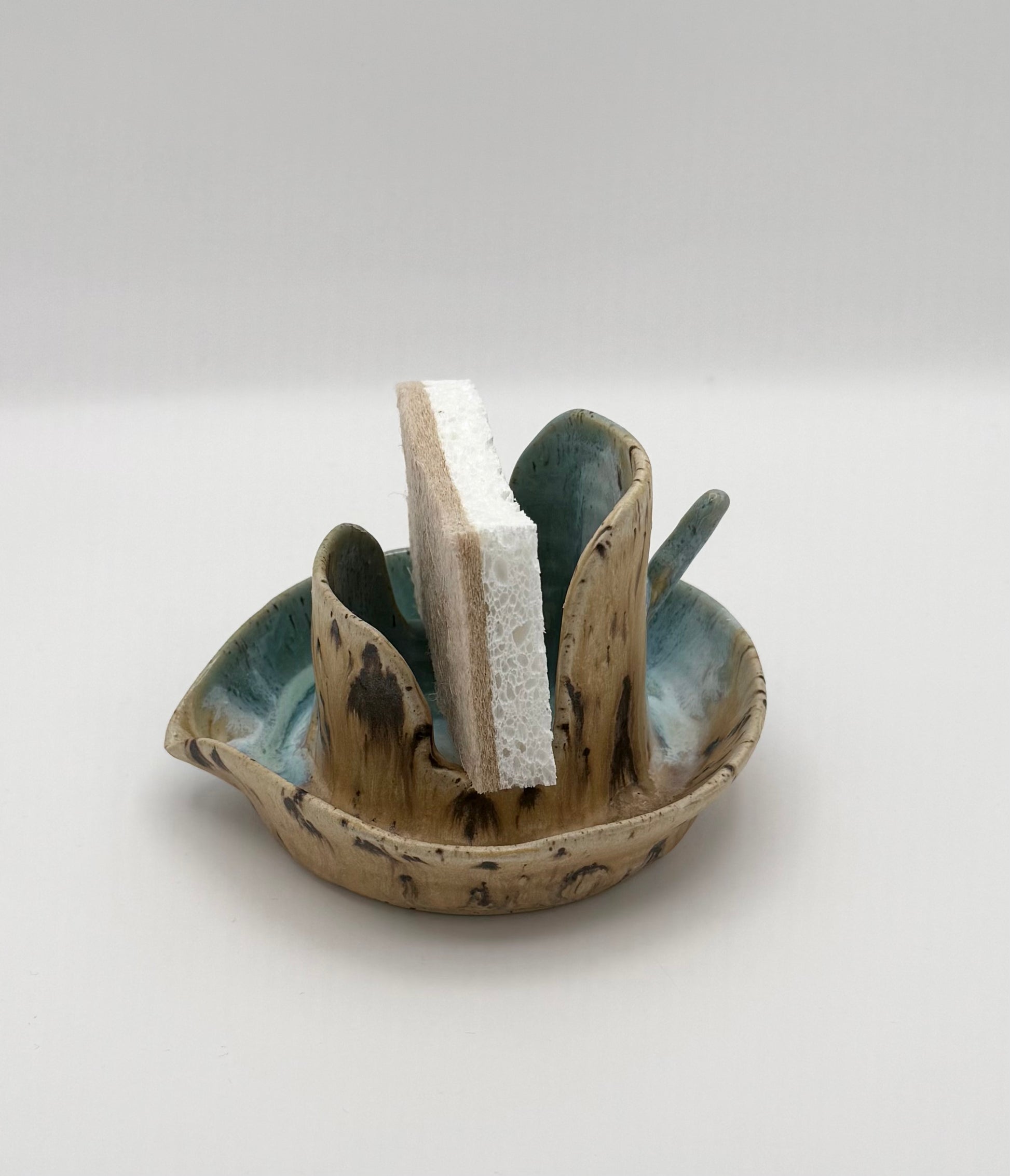 Wheel-thrown in stoneware and finished in a mix of thoughtfully chosen glazes, each piece is one of a kind. Subtle variations in colour and form highlight the beauty of handmade pottery. Designed for the kitchen sink or laundry room, this sponge caddy brings warmth and intention to everyday tasks. A small hook on the back offers a safe place to slip off your rings while baking or washing dishes.
